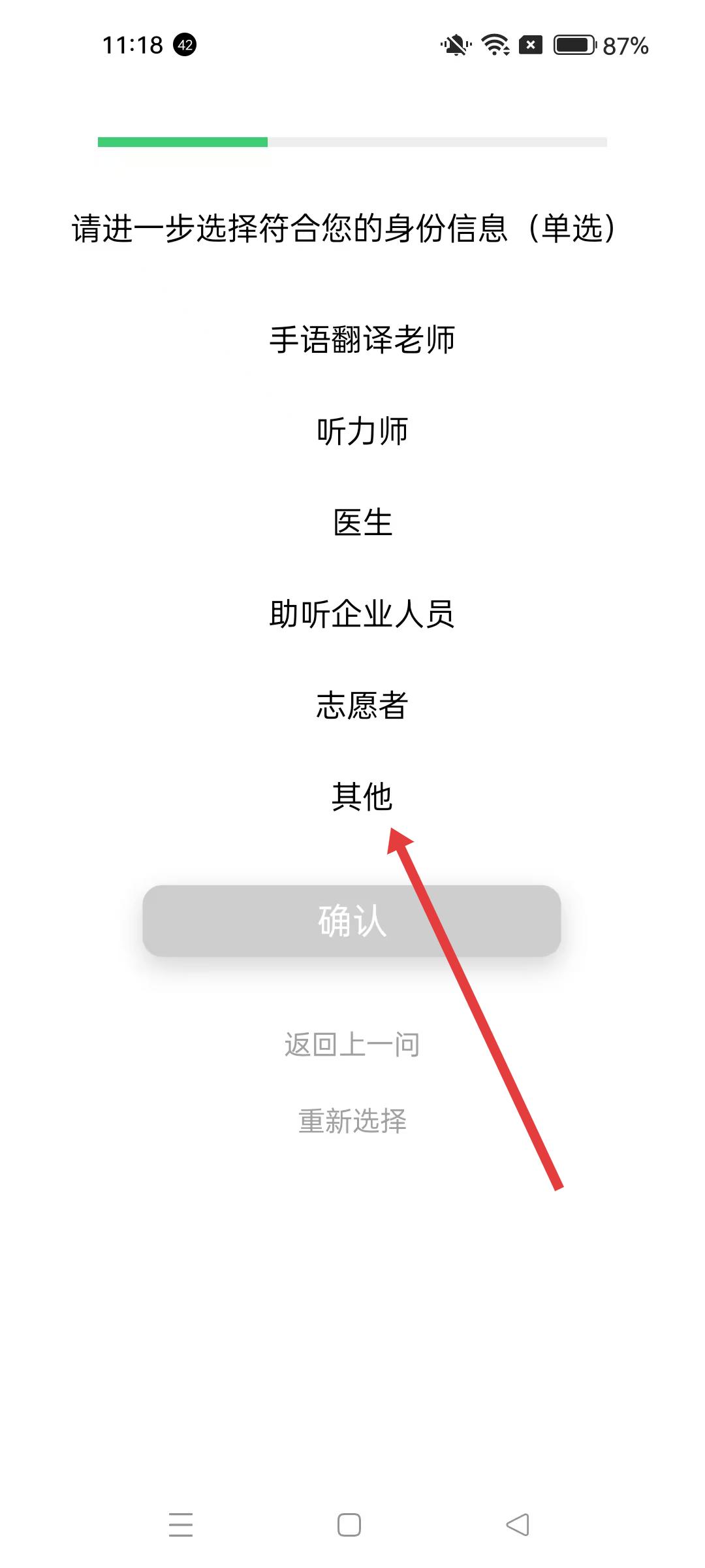 4、接著進一步選擇身份信息,若不屬于手語翻譯老師、聽力師、醫生、助聽企業人員、志愿者等類別。