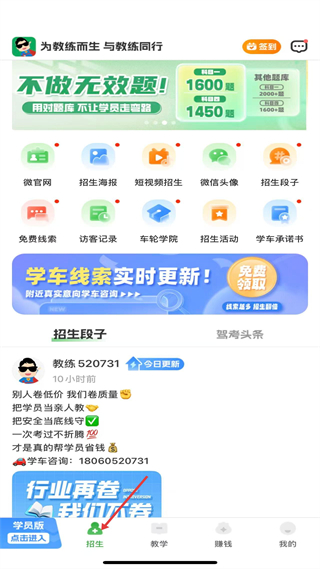 1、招生頁有微官網、招生海報等功能入口,提供學車線索實時更新服務,還有招生段子板塊,助力教練招生宣傳。