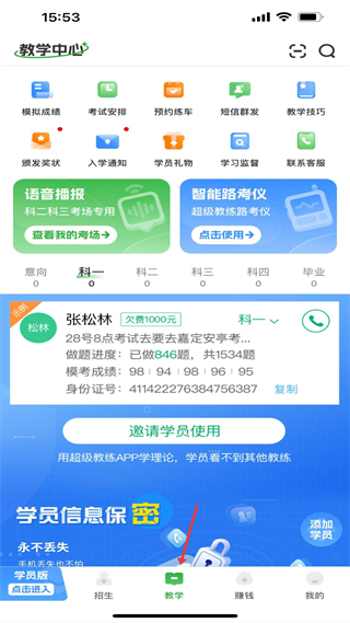 2、教學頁有模擬成績、考試安排等功能,可查看學員科目進度,提供語音播報、智能路考儀等工具,保障學員信息保密。