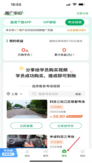 3、賺錢頁展示推廣收益,可售賣考場視頻如科目三松江考場視頻,學員購買后教練可獲提成,助力教練增收。