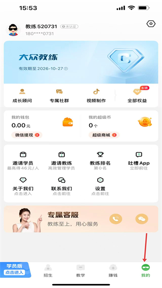 4、我的頁顯示教練賬號信息,有成長顧問、專屬社群等權益,可查看錢包、超級幣,還有邀請學員、教練排名等功能入口。