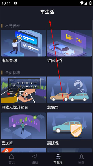 4、點擊車生活選項可進入車生活頁面,查看違章查詢、維修保養等服務,享受多樣汽車生活服務。