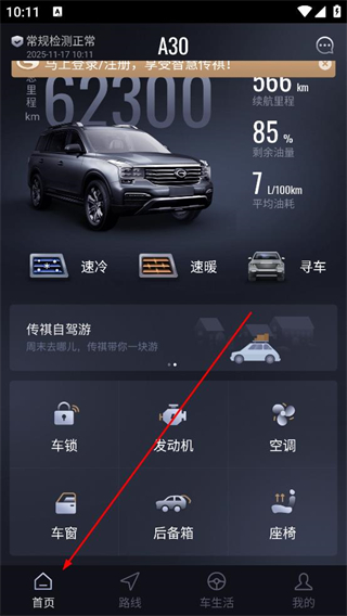 1、打開廣汽智慧傳祺軟件,可查看車輛里程、剩余油量等信息,還能操作車鎖、發動機等功能,滿足車輛基本控制需求。