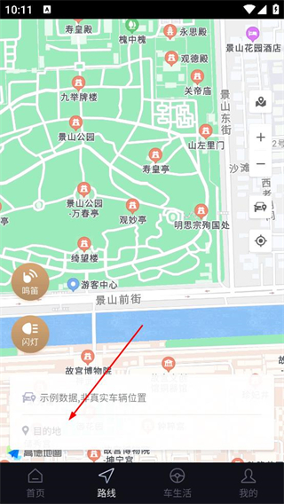 2、點擊路線選項進入地圖頁面,輸入目的地,可查看車輛位置及周邊地圖信息,規劃出行路線。