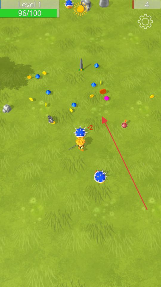 2、在草地場景繼續前行,遭遇藍色帶刺敵人,使用攻擊技能擊敗敵人,收集掉落的金幣、道具,提升角色實力。