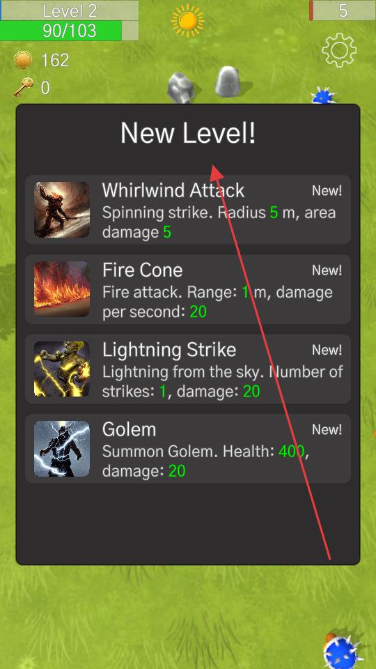 3、升級到Level2后,出現新技能選擇界面,查看Whirlwind Attack、Fire Cone等技能效果,挑選適合戰斗風格的技能學習。
