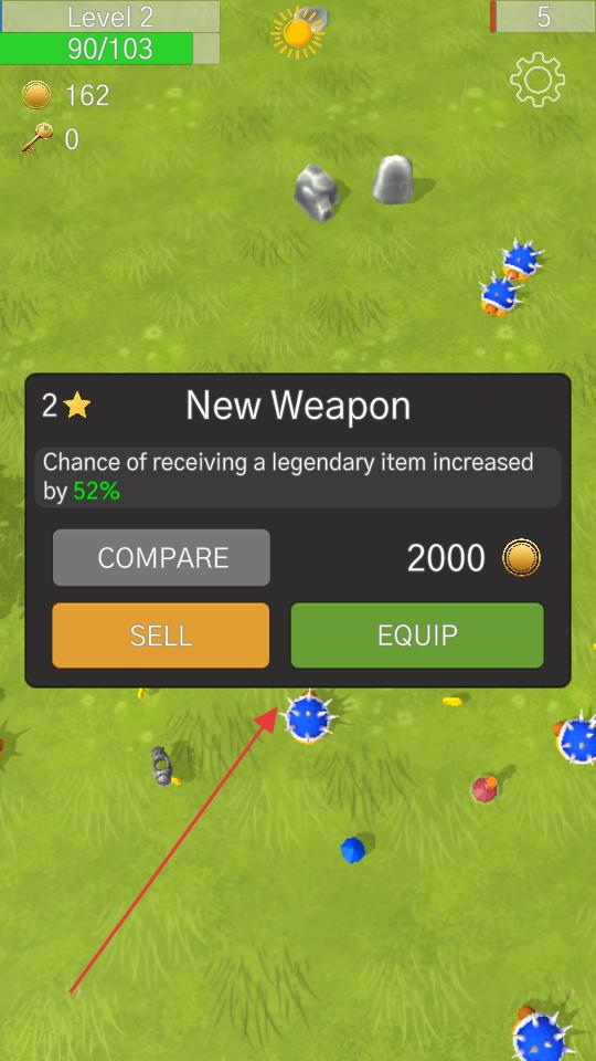 4、獲得新武器后,彈出武器界面,可選擇SELL售賣、COMPARE對比或EQUIP裝備,根據需求操作,增強角色戰斗能力。
