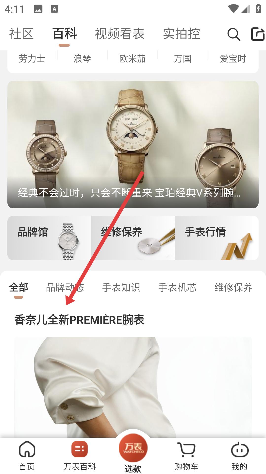 4、登錄成功后進入萬表百科頁面,瀏覽頁面上展示的腕表品牌、維修保養等信息,找到香奈兒全新PREMIèRE腕表相關內容進行查看。