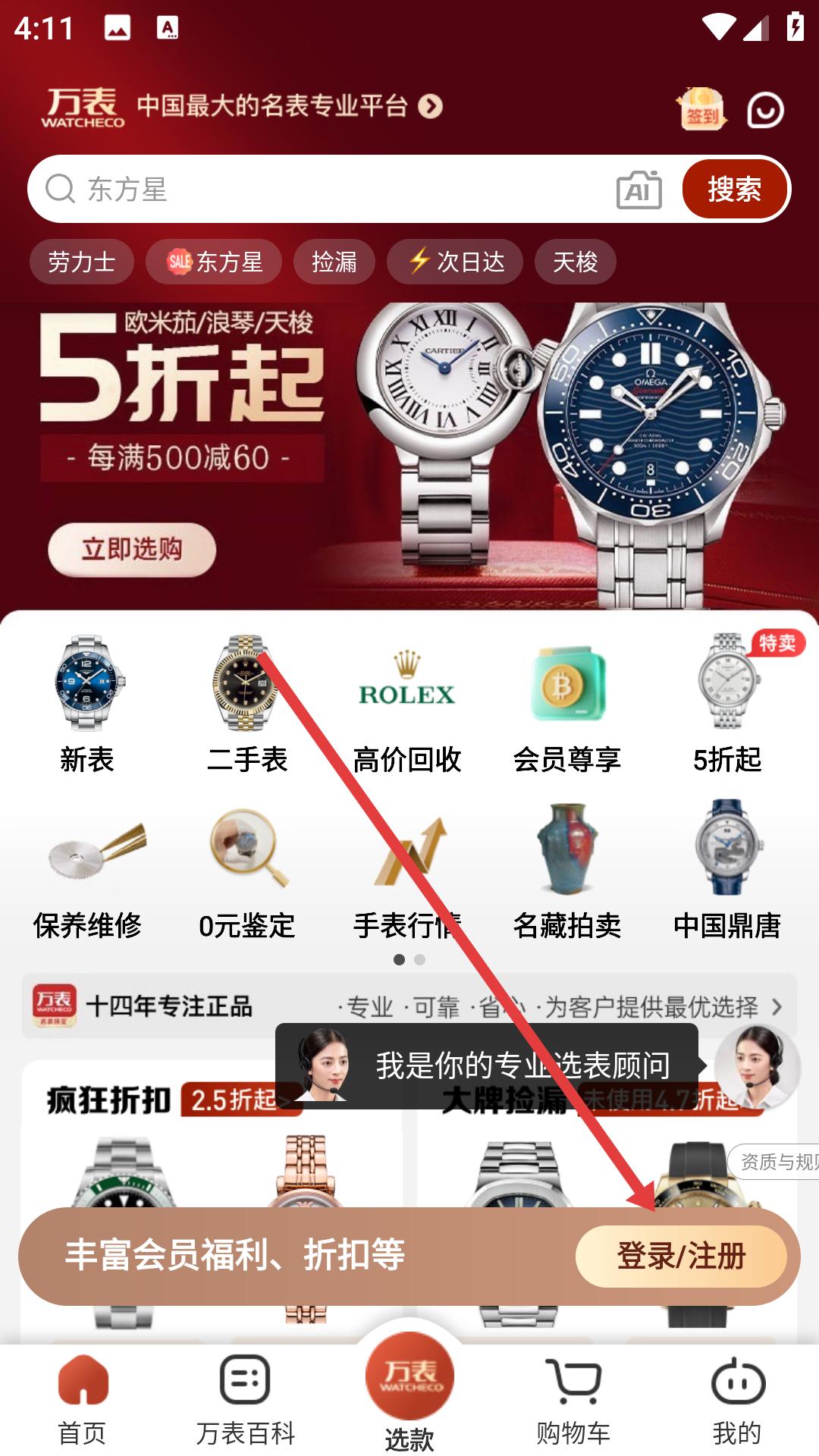 2、進能看到各類腕表相關服務入口,如搜索、新表、二手表等,點擊登錄,注冊按鈕,進入登錄頁面。