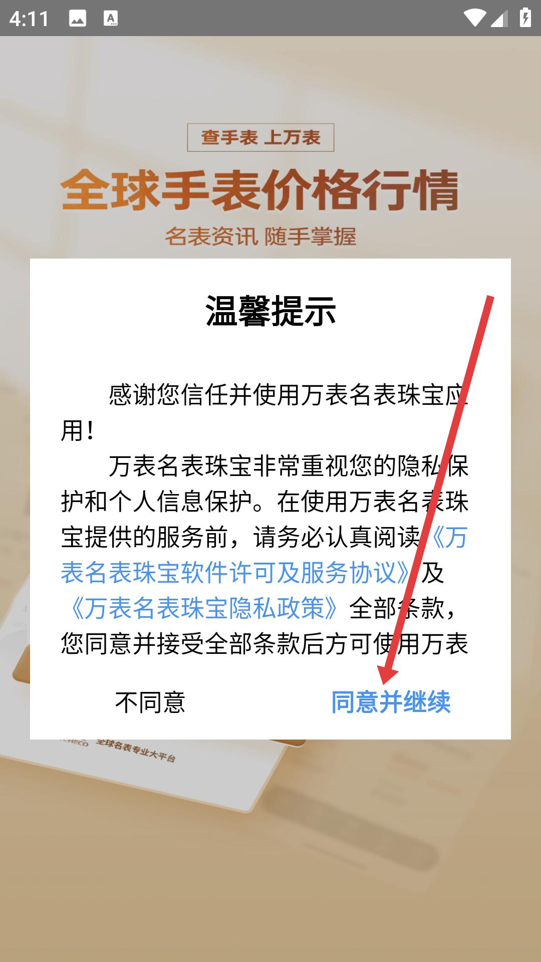 1、打開萬表全球名表app,首先會看到溫馨提示彈窗,提示需閱讀相關協議和政策,點擊同意并繼續,進入APP主界面。