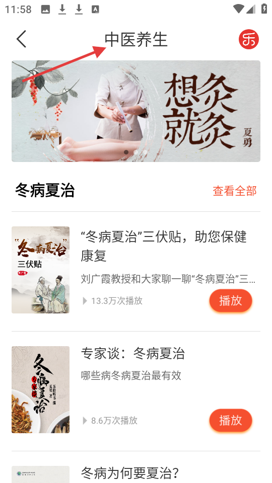 2、中醫養生頁以艾灸圖開篇,主打冬病夏治,有專家音頻講解三伏貼等保健內容助用戶了解中醫養生。