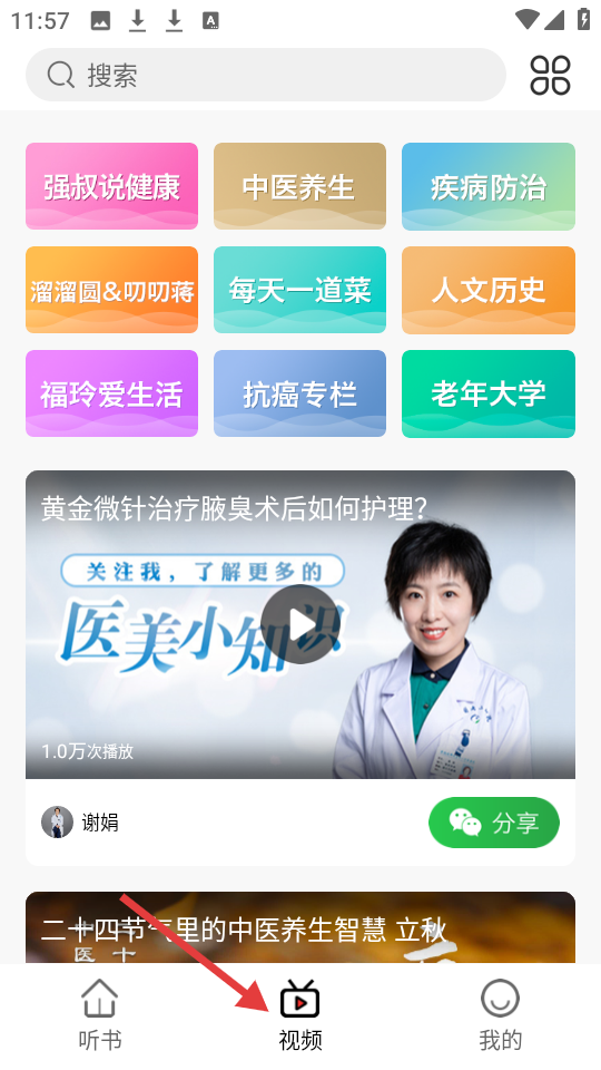 3、視頻界面有強叔說健康等頻道,展示醫美小知識視頻,播放量1.0萬次,支持分享傳遞多樣健康資訊。