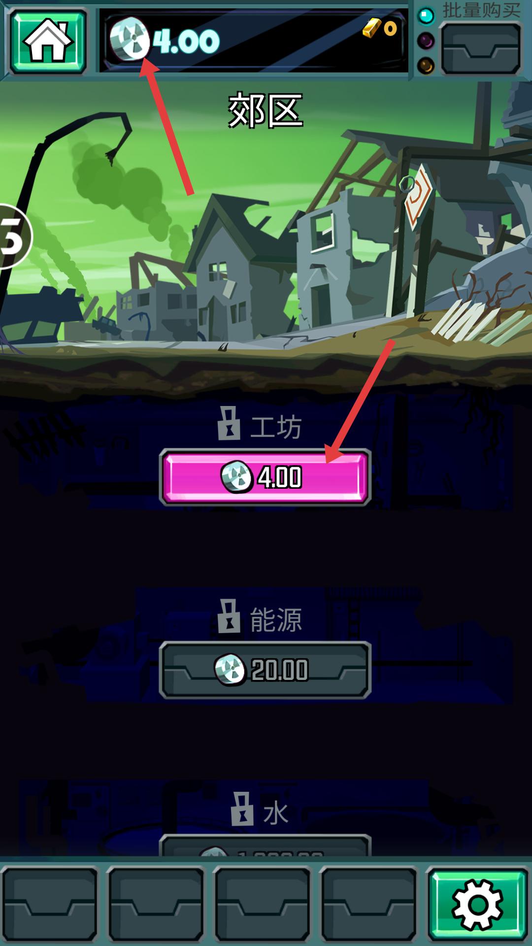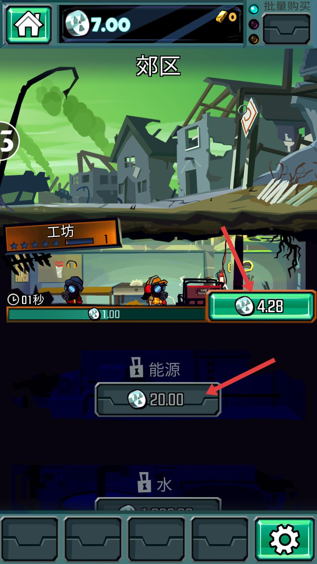 3、解鎖工坊后,可在工坊中獲取資源,同時要關注其他未解鎖選項,如能源,積攢足夠資源后,準備解鎖下一個功能。