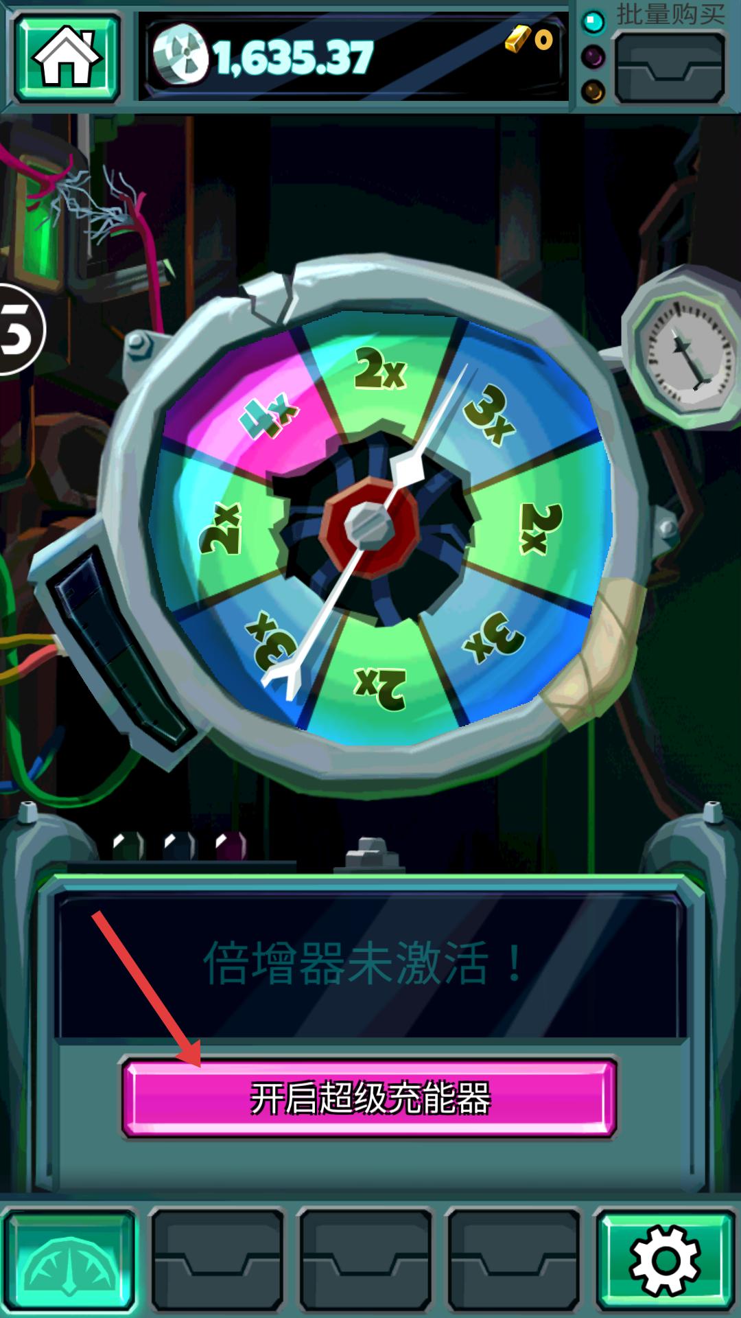 4、當有轉盤等道具且倍增器未激活時,點擊開啟超級充能器按鈕,嘗試激活倍增器,利用轉盤獲取資源倍數加成,提升資源獲取效率。
