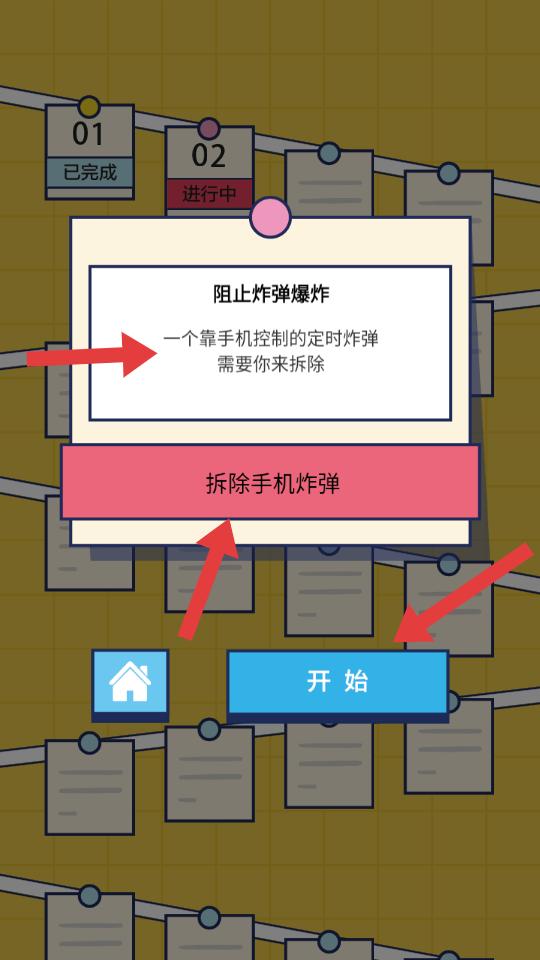 1、進入游戲,能看到關卡進度,01關卡已完成,02關卡處于進行中,可選擇進行中的關卡開啟拆彈任務。