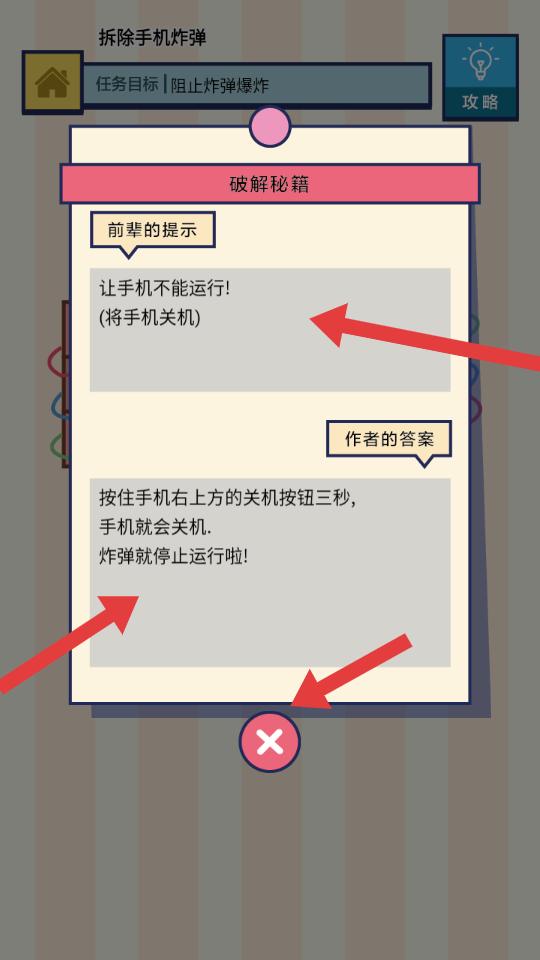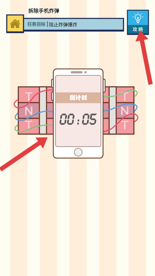 3、拆彈時手機連接著TNT,有倒計時限制,若沒思路,可點擊攻略按鈕,獲取拆彈的方法提示。