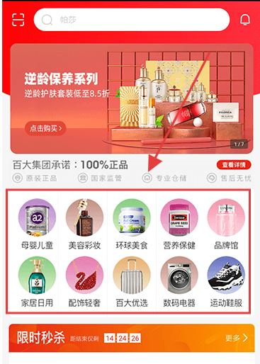 1、有逆齡保養系列折扣、正品承諾,還有母嬰兒童、美妝等分類入口,點擊可進入對應購物專區。