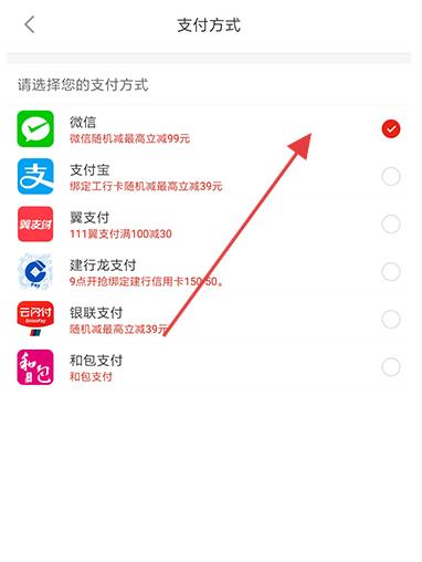 2、支付方式選擇頁,列出微信、支付寶等多種支付渠道,部分含隨機立減優惠,勾選對應方式完成訂單支付。