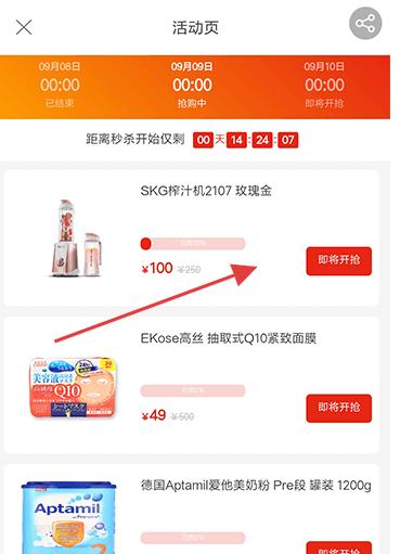 3、活動頁展示SKG榨汁機等商品,標注秒殺時間、優惠價,倒計時提醒,點擊即將開搶可參與限時秒殺活動。