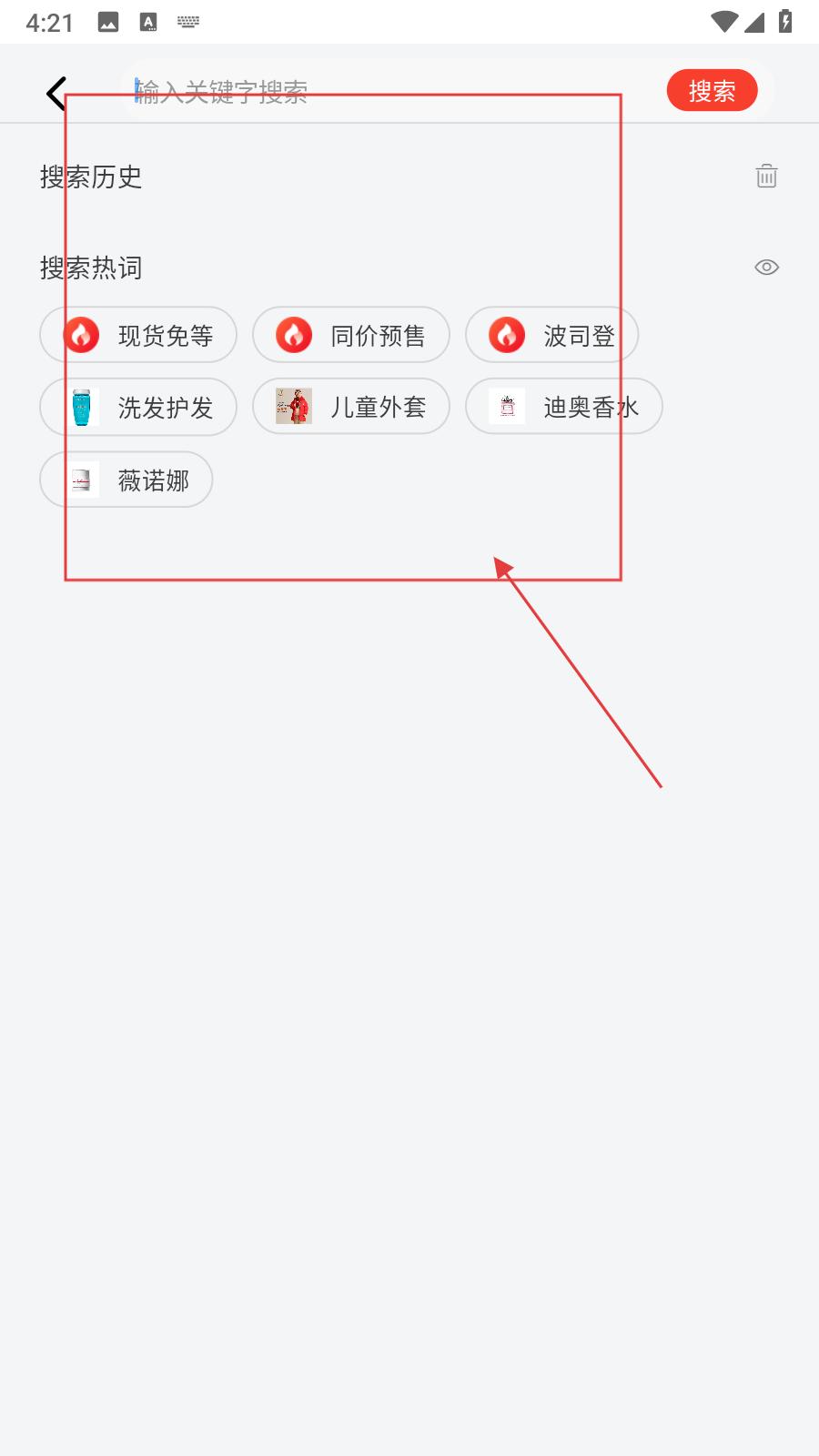 1、在搜索界面,可輸入關鍵詞搜索商品,查看搜索歷史,還能點擊現貨免等、同價預售等搜索熱詞快速查找商品,助力用戶高效找到心儀商品。