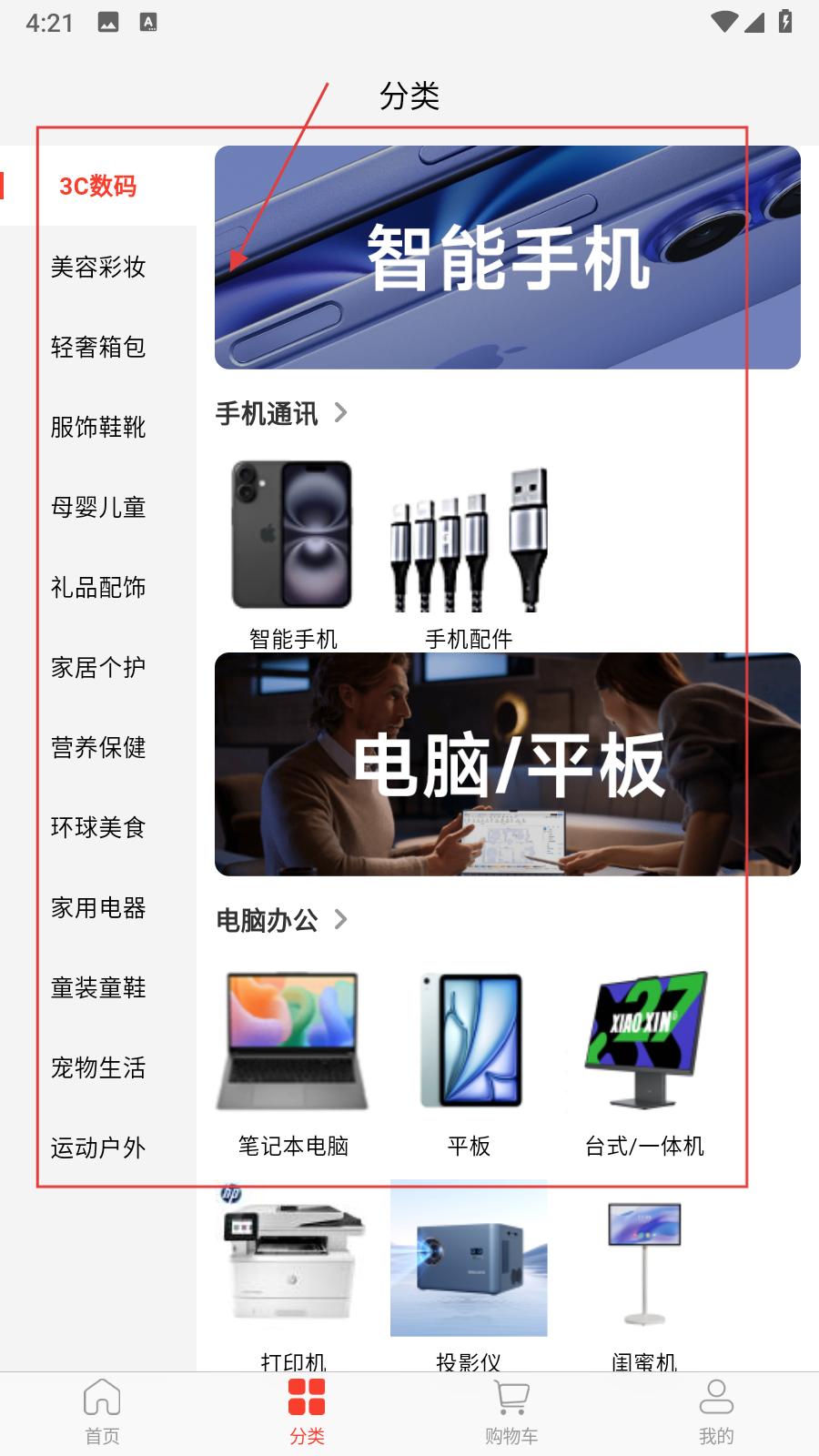 3、分類界面有3C數碼、美容彩妝等眾多分類,以3C數碼為例,涵蓋智能手機、電腦辦公等板塊,方便用戶按品類精準查找商品,提升購物效率。