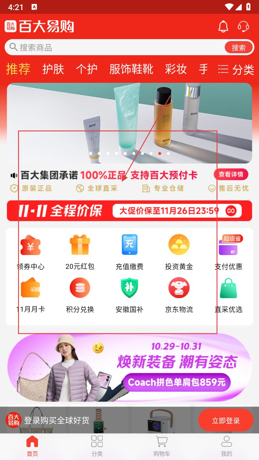 4、首頁有領券中心、充值繳費等功能入口,還有全程價保活動,商品涵蓋護膚、個護等品類,百大集團承諾100%正品,支持預付卡,助力用戶放心購物。