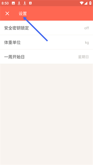 1、設置頁,有安全密鑰鎖定、體重單位、一周開始日等設置項,用戶可根據需求調整APP的基礎設置。