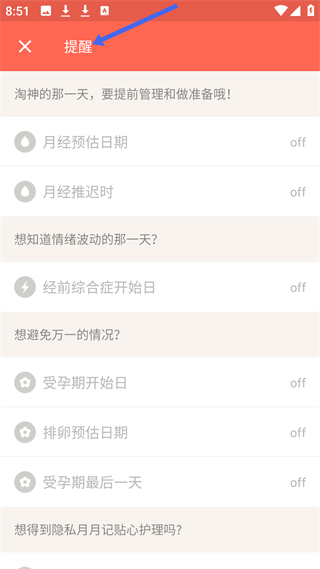 2、提醒頁,涵蓋月經預估日期、經前綜合癥開始日、受孕期開始日等多項提醒項,幫助用戶提前管理健康節點。