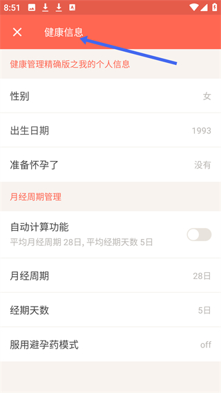 4、健康信息頁,包含個人信息性別、出生日期等和月經周期管理自動計算功能、月經周期等,助力用戶精準管理健康狀況。