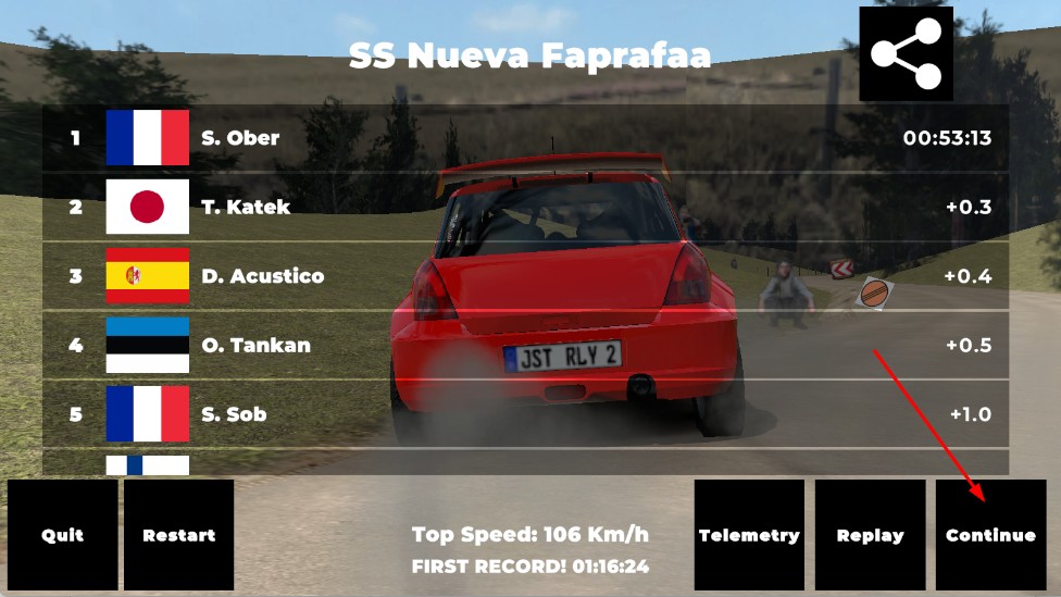 4、完成當前賽道后,在結算界面點擊Continue按鈕,可繼續進行下一段賽車競速挑戰。