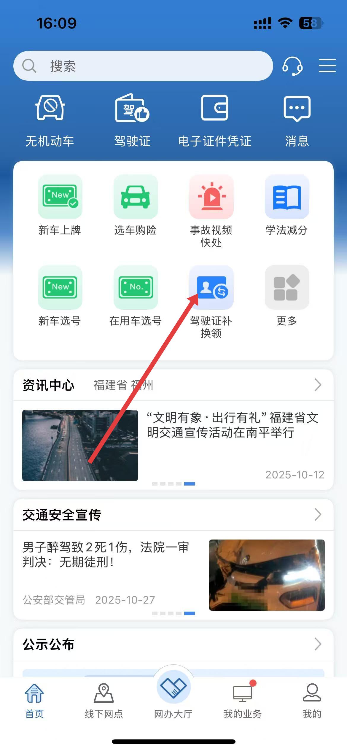 1、進入界面后點擊駕駛證補換領選項,可開啟駕駛證補換領業務辦理流程,開始申請補換領駕駛證。