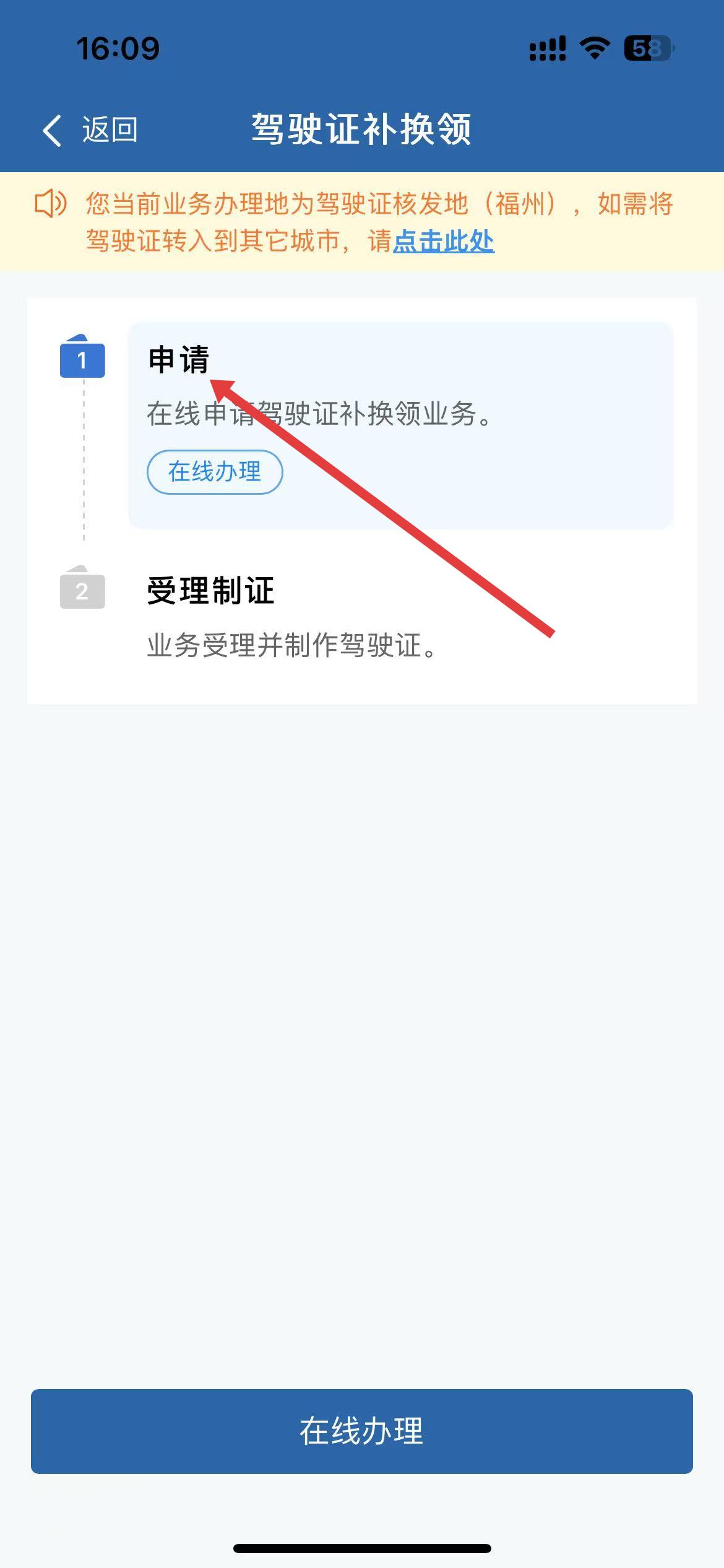 2、駕駛證補換領頁面點擊申請,可在線辦理補換領業務,推進業務辦理進度。