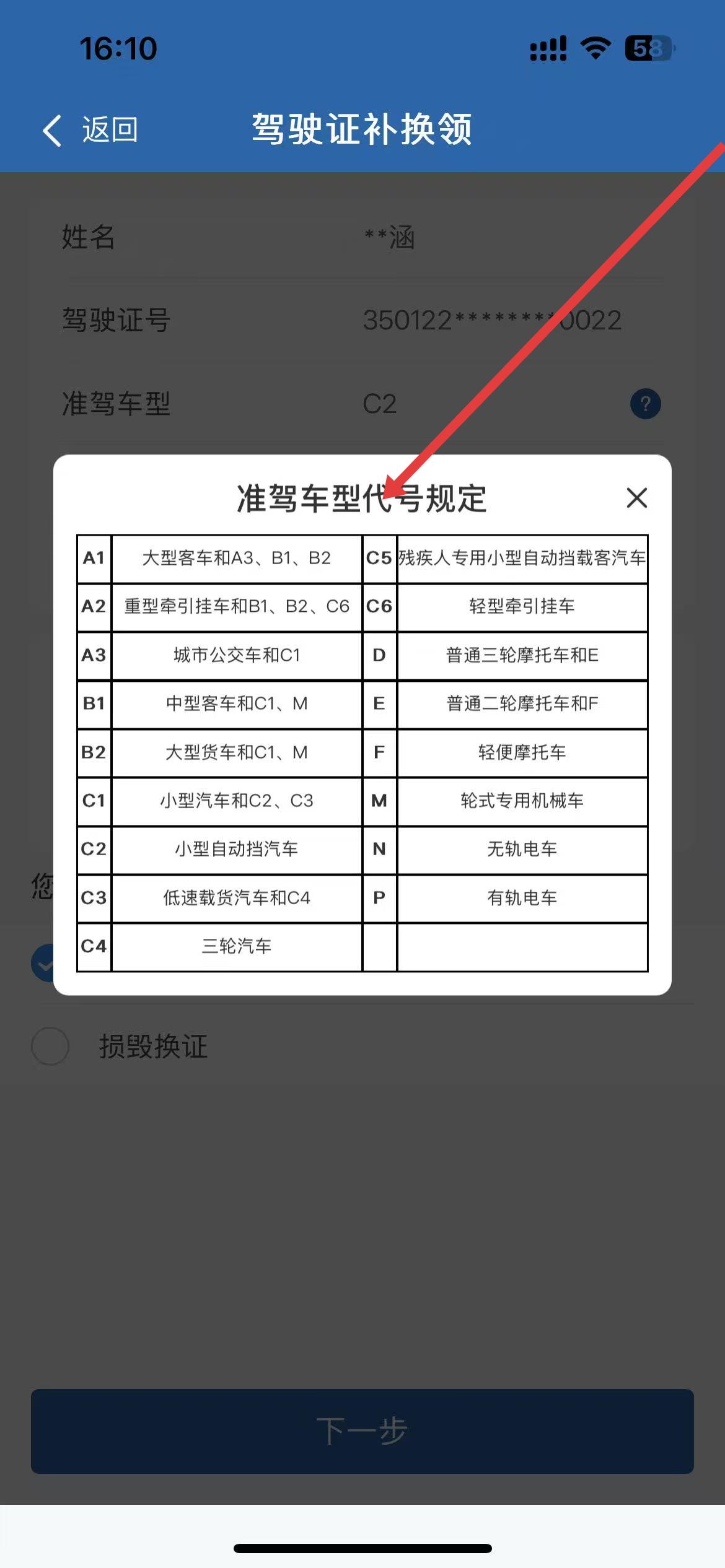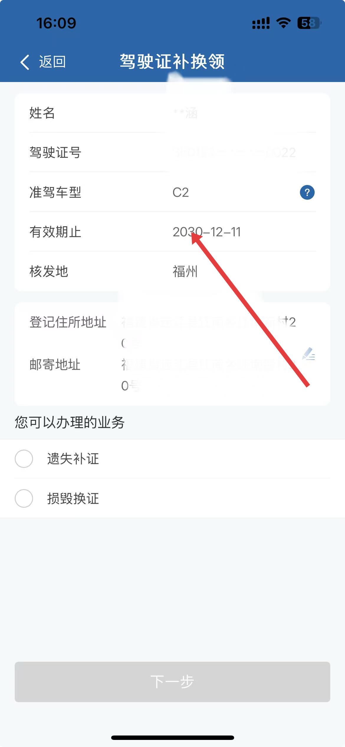 3、進入信息填寫頁面,可查看駕駛證號、準駕車型、有效期止等信息,確認信息無誤后選擇業務類型。