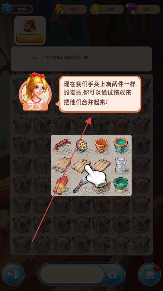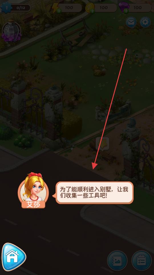 1、進入合并浪游戲,根據艾莎提示,為進入別墅收集工具,在場景中尋找可互動物品,開啟工具收集任務。