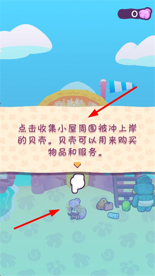 1、點擊收集小屋周圍被沖上岸的貝殼,這些貝殼能用來購買物品和服務,先完成收集來積累資源。