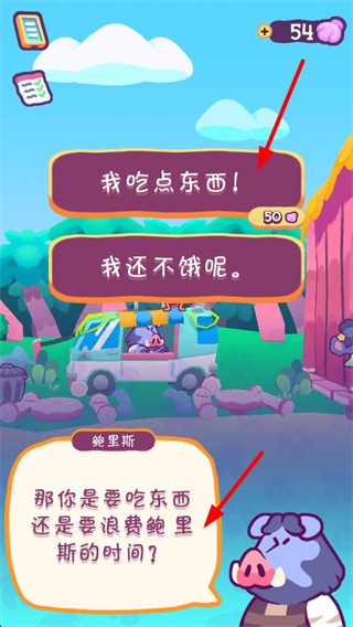 4、遇到角色互動界面時,可選擇如我吃點東西等選項,消耗對應數量的貝殼,完成互動來推進游戲進程。