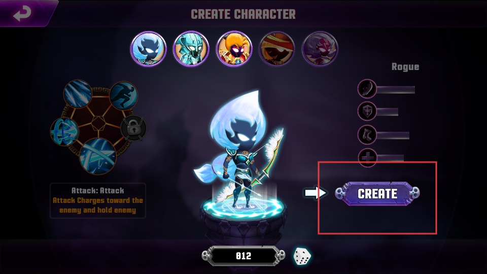 1、在角色創建界面,選擇心儀的角色,點擊CREATE按鈕,創建屬于自己的戰斗角色。