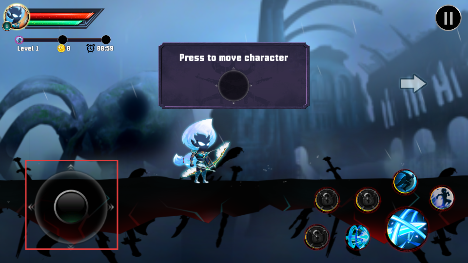 2、進入關卡后,操控虛擬搖桿移動角色,利用角色的技能和武器,與敵人展開戰斗,擊敗沿途的敵人。
