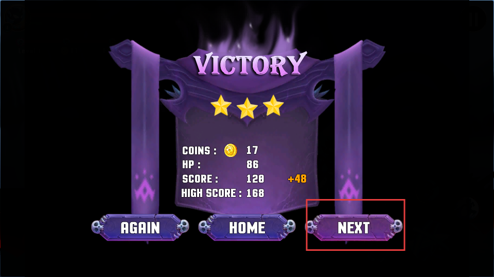 3、成功擊敗所有敵人后,關卡勝利,會獲得金幣、分數等獎勵,點擊NEXT按鈕,就能進入下一個關卡繼續挑戰。