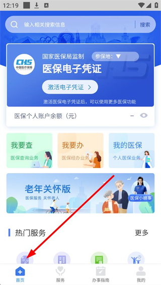 1、進入醫保服務應用首頁,有搜索欄可查詢醫保信息,展示醫保電子憑證板塊,可激活電子憑證,還有我要查、我要辦、我的醫保功能入口。