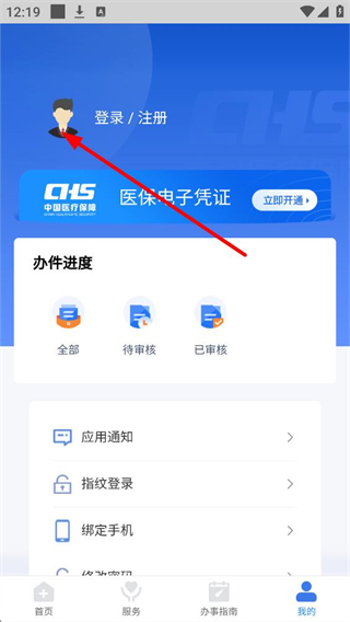 2、點擊我的進入個人頁面,有登錄、注冊入口,可查看辦件進度,包括全部、待審核、已審核狀態,還有應用通知、指紋登錄。