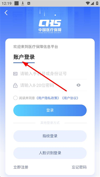 3、賬戶登錄頁面,可輸入手機號或身份證號、密碼,勾選同意用戶隱私政策和用戶協議后點擊登錄,也可選擇指紋登錄、人臉識別登錄或立即注冊方式。