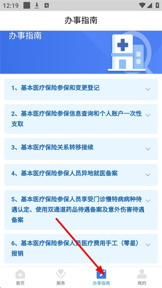 4、點擊辦事指南進入對應頁面,可查看基本醫療保險參保和變更登記、參保信息查詢等多項辦事指南,幫助用戶了解醫保業務辦理流程。