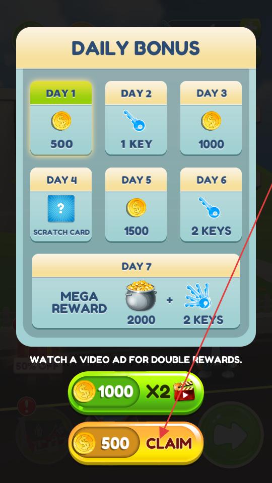 1、點擊CLAIM按鈕,領取每日獎勵,首日可獲取500金幣,若想得到雙倍獎勵,可選擇觀看視頻廣告,此時能看到每日福利界面里不同天數的獎勵選項。