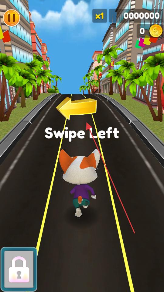 4、進入跑酷場景后根據提示向左滑動屏幕,操控萌寵角色在街道上向左移動,躲避沿途障礙并收集金幣,開啟城市街道的跑酷冒險,推動游戲進程。