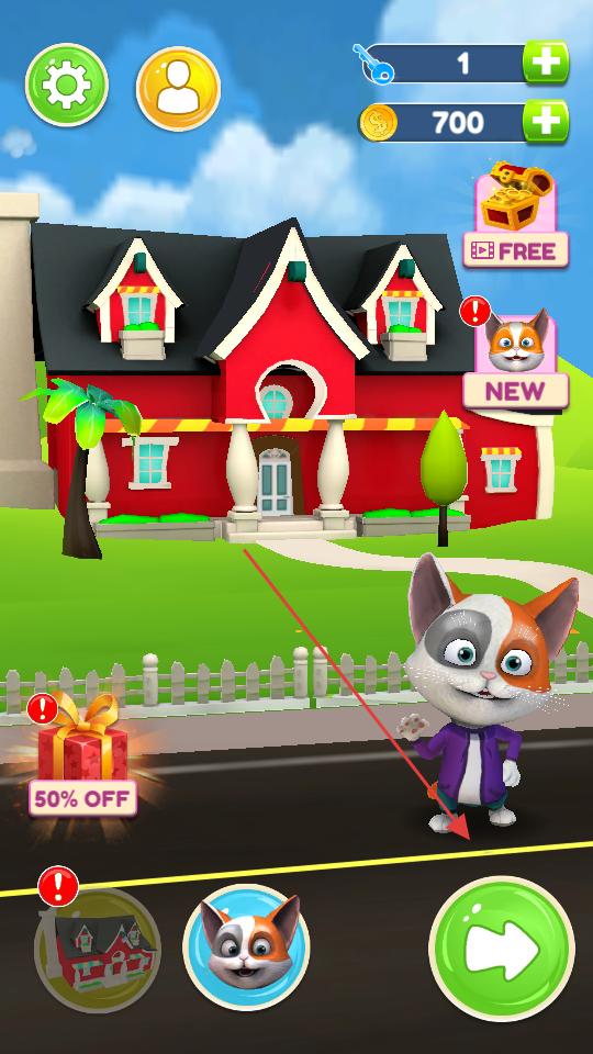 3、回到游戲主界面看到紅色房屋與萌寵角色,點擊右下角箭頭按鈕,進入跑酷準備場景,萌寵角色會出現在街道上,等待開啟跑酷。