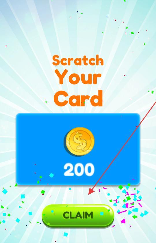 2、若獲得刮刮卡,進入刮刮卡界面點擊綠色CLAIM按鈕,刮開卡片后獲取200金幣獎勵,界面會出現彩色碎片特效,讓獲取獎勵的過程更有趣。