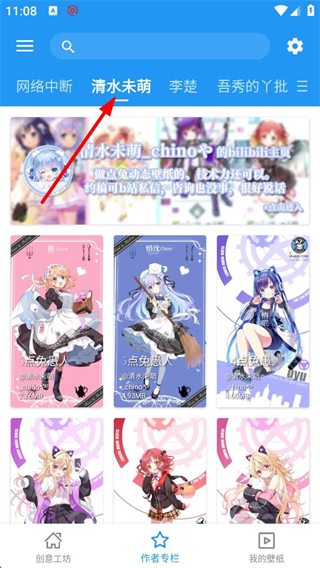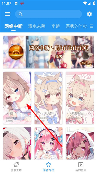 2、進入作者專欄頁面,可見不同作者的分類標簽,選擇網絡中斷作者,能瀏覽該作者發布的壁紙作品,點擊目標壁紙即可進入其詳情頁面。