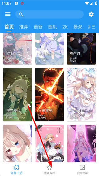 1、進入創意工坊首頁,頂部設搜索欄及首頁推薦等分類標簽,展示各類壁紙內容,點擊底部作者專欄按鈕,即可進入對應作者的作品展示頁面。