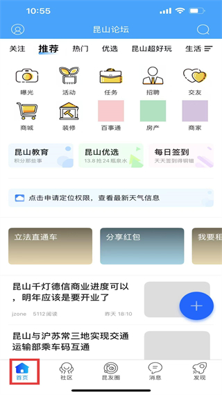 1、首頁推薦板塊,有曝光、活動等功能入口,還有昆山教育、優選等板塊及本地資訊,是用戶獲取本地信息和服務的入口。